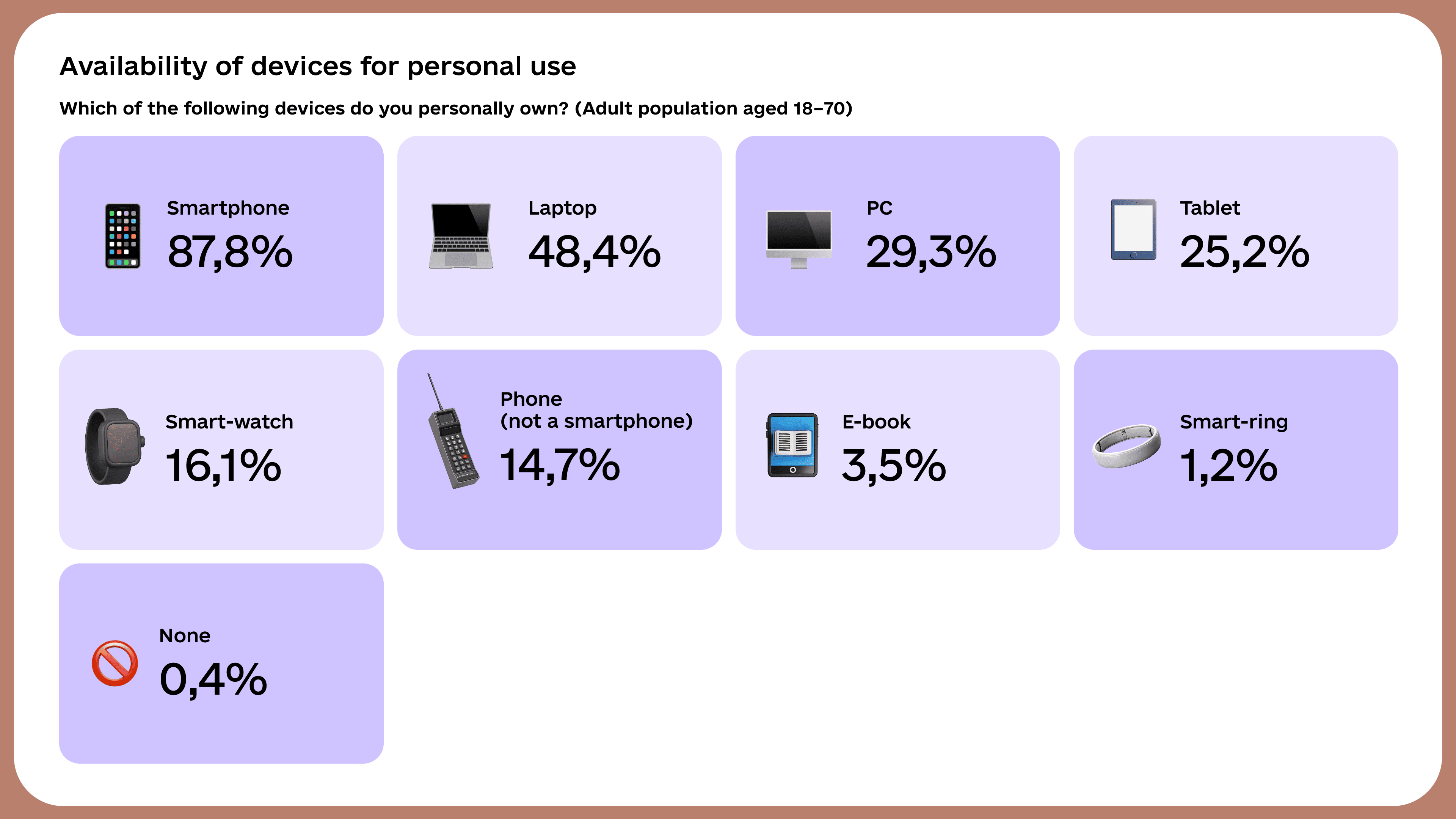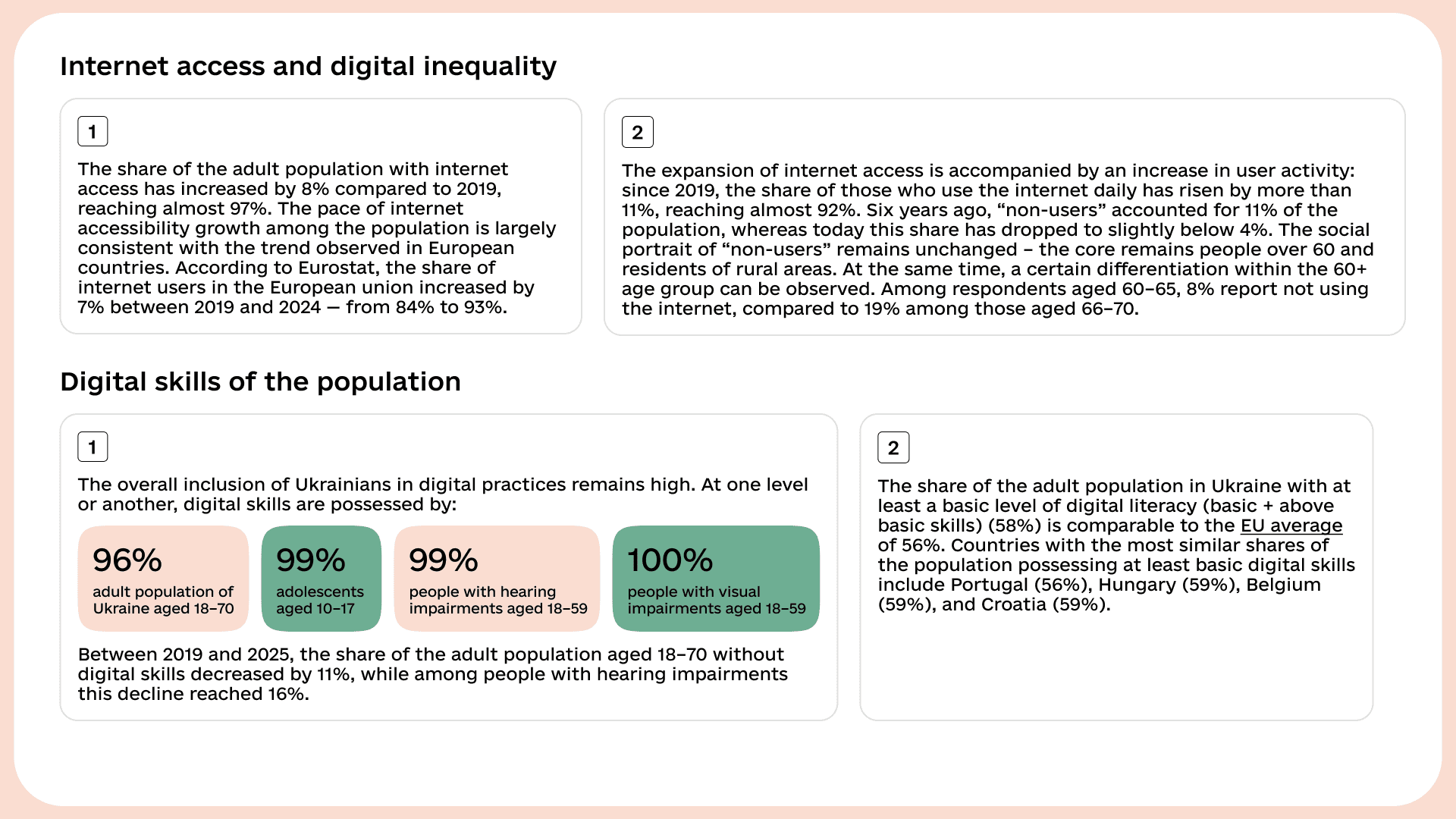 Since 2019, the percentage of adults without basic digital skills has dropped from 15% to just 4%. Even amid wartime, Ukrainians remain highly connected — 97% have internet access and 92% use it daily.