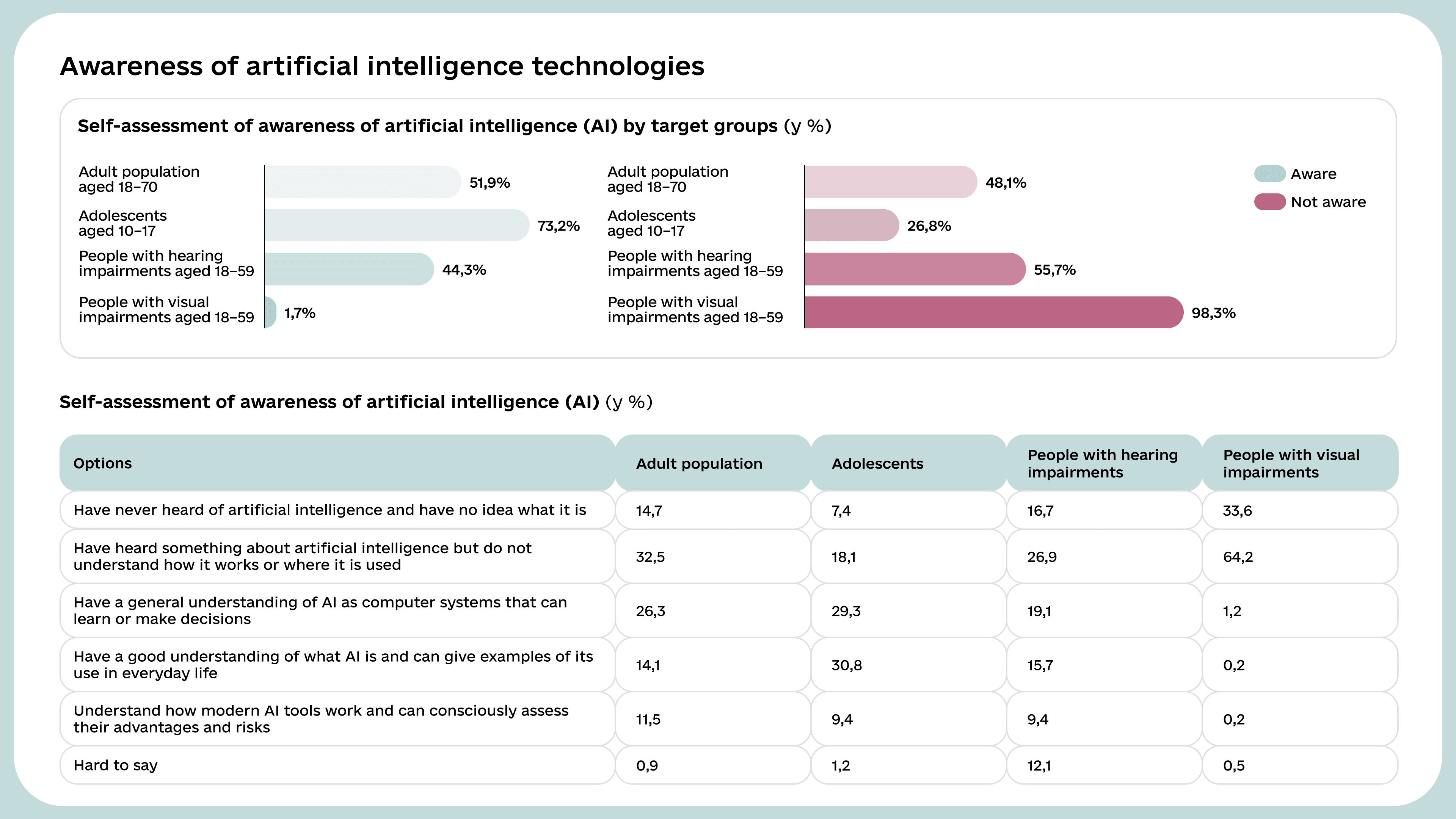 A key focus in 2025 is artificial intelligence. The study shows that 42% of adults and 70% of teens actively use AI tools — to write, learn, find information, or work — and more than half of respondents have already made decisions based on interactions with AI systems.