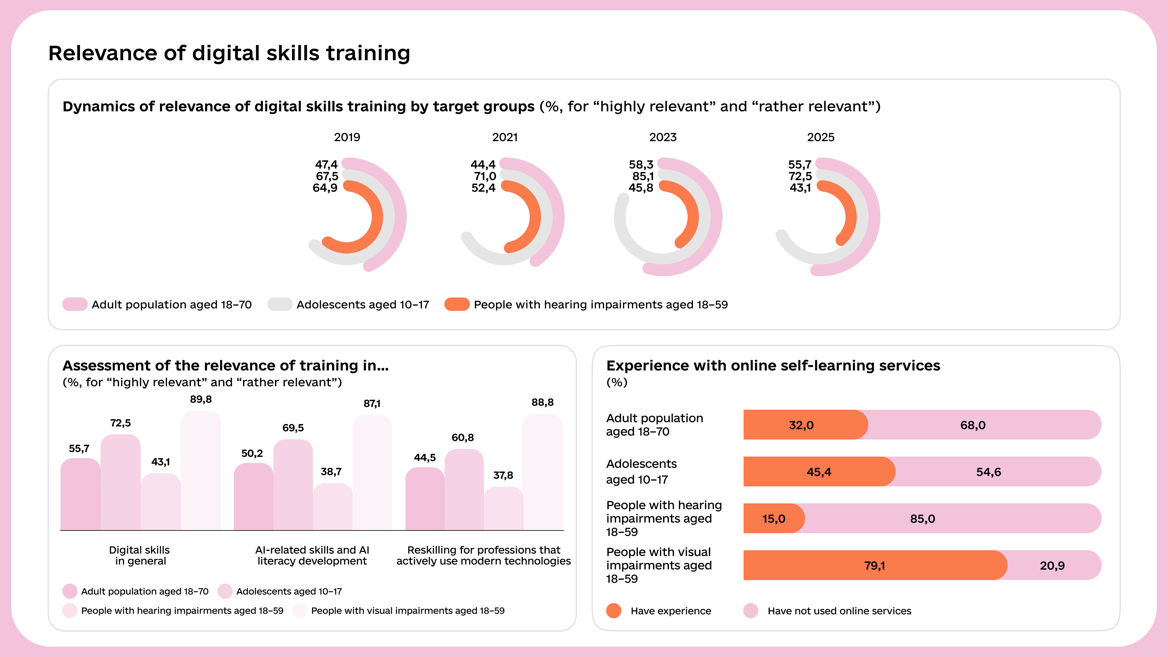 This year, for the first time, the survey included visually impaired respondents. Despite their high engagement online, only 3% report above-basic digital skills, primarily due to the poor accessibility of digital services for assistive technologies — a challenge the government and partners aim to address.