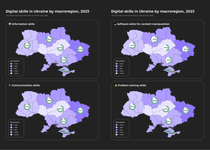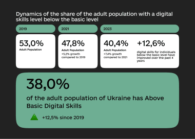 Recognizing the risks associated with the digital competency deficit, the Ukrainian government has adopted a data-driven approach to policymaking, ensuring that digital skills development is strategically aligned with national economic and workforce needs. The Ministry of Digital Transformation, the Eastern Europe Foundation within the EGAP program, conducted sociological research on digital skills in Ukraine in 2019, 2021, and 2023. The 2019 survey was the first sociological study of digital skills in Ukraine’s history. According to the survey, 53% of Ukrainians (aged 18 to 70) had digital skills below the basic level, according to the European Commission’s methodology, and 15% had no such skills. At the same time, only 47% of Ukrainians were interested in improving their digital skills. There were also significant age differences in digital skills: 66.1% of Ukrainians aged 10-17 had skills at the «above basic» level, while older Ukrainians lagged far behind in digital skills. The 2021 study showed an increase in digital skills. The share of Ukrainians whose digital skills are below the «basic level» decreased by 5.2% or 1.42 million people to 47.8%. The share of Ukrainians with no digital skills decreased by 4% or 1.09 million people.