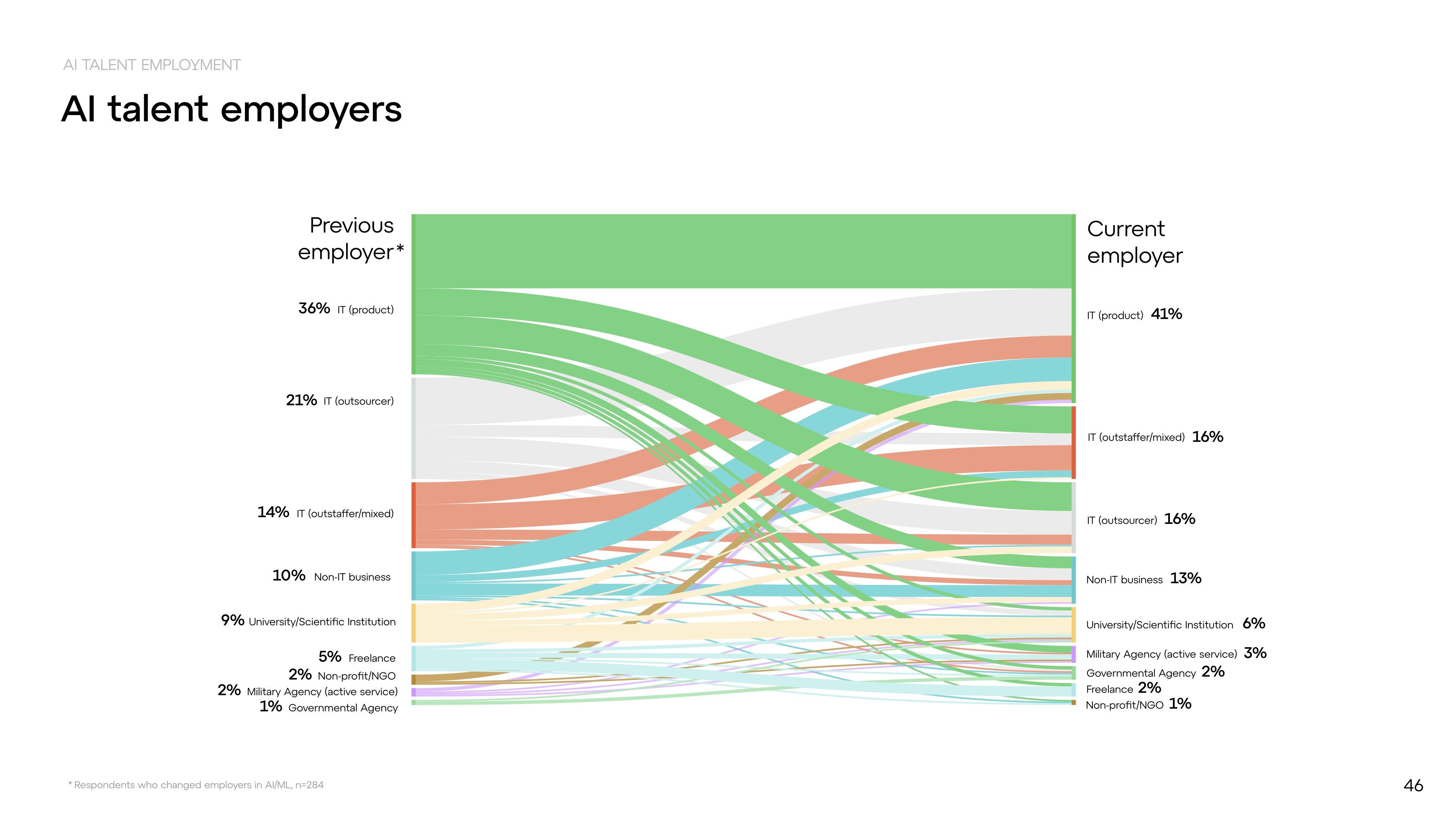 Most AI specialists work at product companies (41%), while a growing share (13%) applies AI in non-IT sectors like agriculture, finance, telecom, and industry. Large organizations — especially those with over 1,000 employees — are starting to build in-house AI teams. Some of these use machine learning to assess drone imagery of farmlands or optimize supply chains.