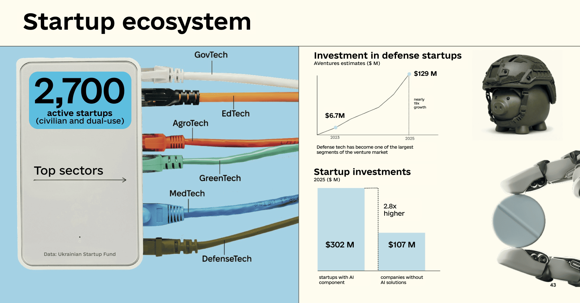 Ukraine is also home to 2,700 civilian and dual-use startups, with the most common sectors being DefenseTech, EdTech, MedTech, GreenTech, AgroTech, and GovTech.