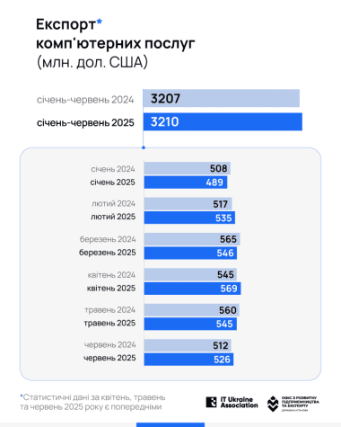 За їх словами, у 2025 році найвищі обсяги експорту комп’ютерних послуг були зафіксовані у квітні ($569 млн), березні ($546 млн) та травні ($545 млн). Аналогічно, найкращі результати 2024-го припали на березень ($565 млн), травень ($560 млн) та квітень ($545 млн). Найнижчі місячні обсяги у 2025 році були в січні — $489 млн, а у 2024-го — у січні ($508 млн), лютому ($517 млн) та червні ($512 млн).