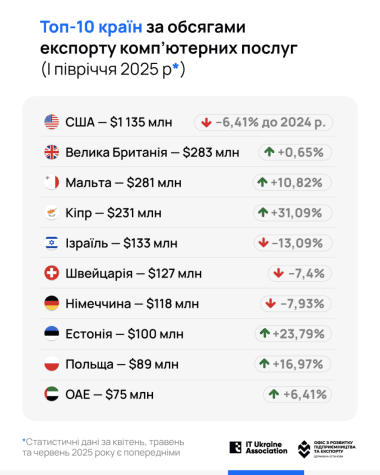 Найвищий приріст експорту комп’ютерних послуг за перше півріччя 2025 року показали: Фінляндія — $13 млн (+49,75%), Латвія — $7 млн (+44,33%), Люксембург — $7 млн (+35,43%). Спад зафіксовано по Австрії — $13 млн (–43,99%) та Грузії — $4 млн (–29,95%)
